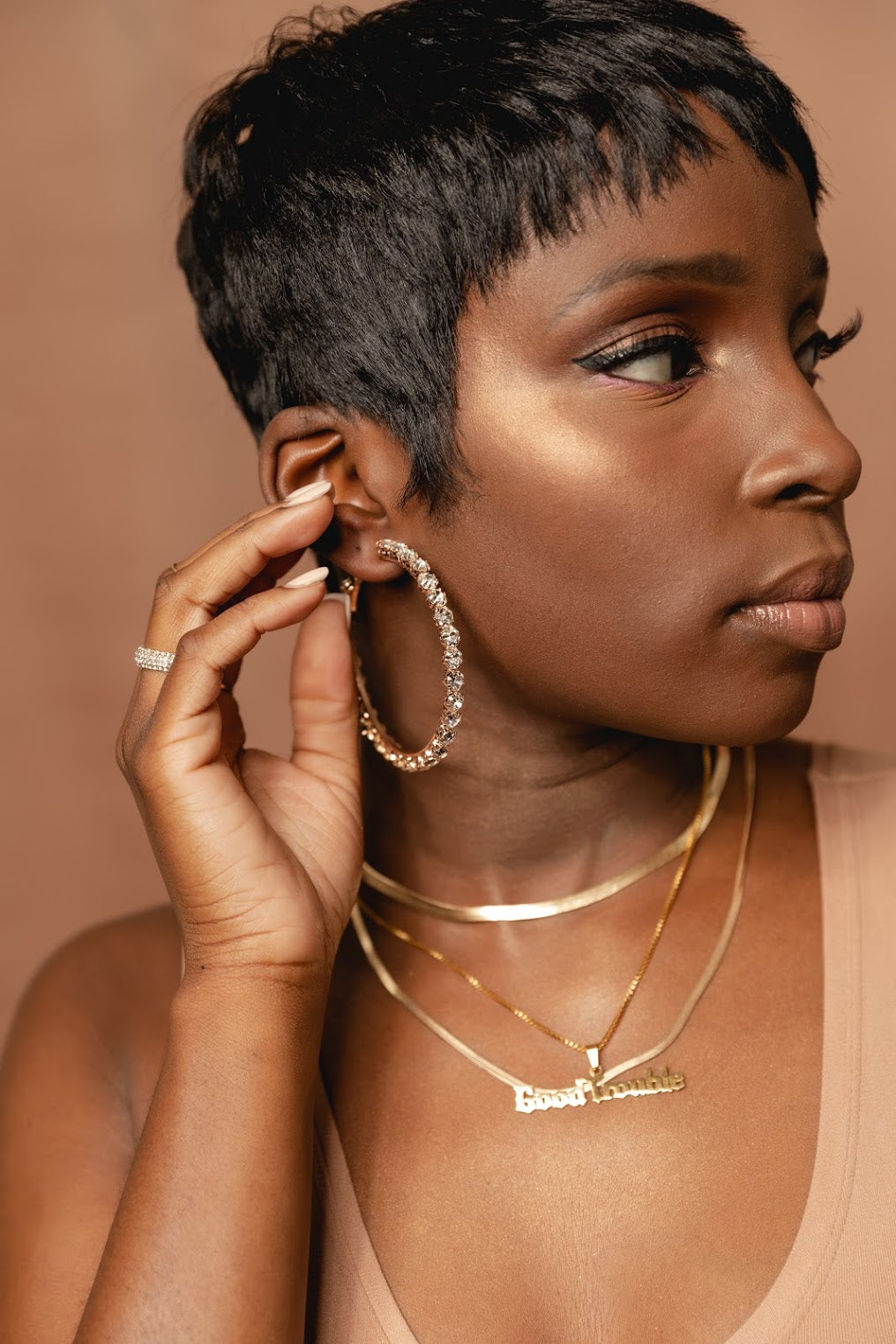 These medium-sized crystal hoops have a gold base and a lightweight design, making them perfect for all-day or all-night wear. With a diameter of 6.8cm or 70mm, this versatile statement piece is the perfect finishing touch for any outfit. Remember to handle your TerriAshleyNYC pieces with care and avoid contact with oils, water, and direct perfume application.